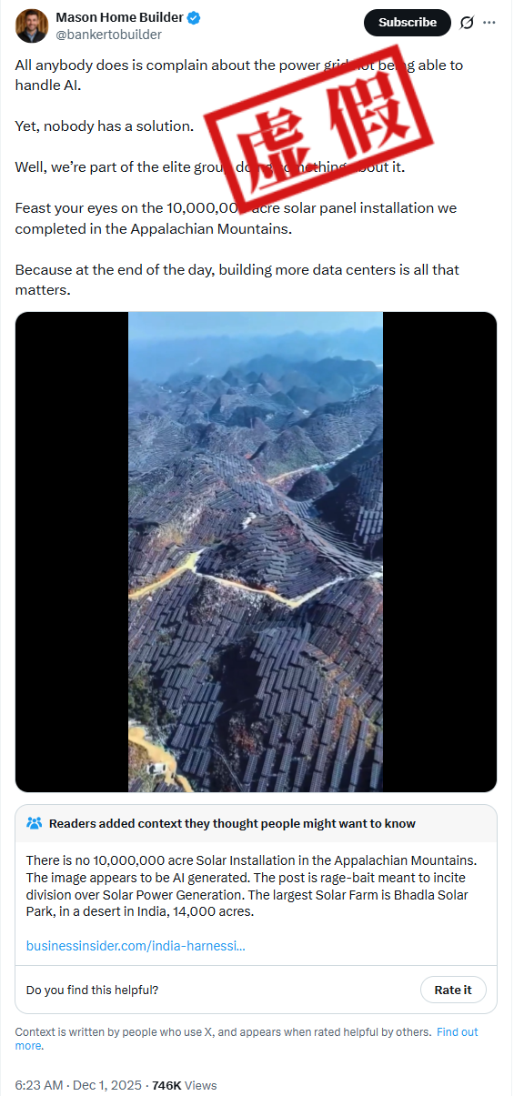与此同时,一名IP地址显示为美国俄亥俄州的建筑商声称,视频所示为其在北美洲东部阿巴拉契亚山脉建设的一处太阳能项目,工程占地达1000万英亩。还有说法声称,该视频为AI生成。