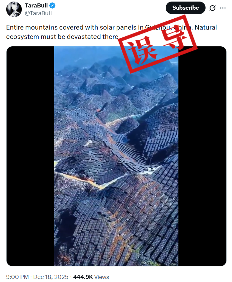 近日,一段展示大片山地密集铺设光伏板的视频在海外社交平台广泛流传。画面中,连绵起伏的山丘被排列整齐的太阳能电池板覆盖。视频发布者称,该场景位于中国贵州,并断言“整座山被太阳能板覆盖,当地自然生态系统必然遭到破坏”。